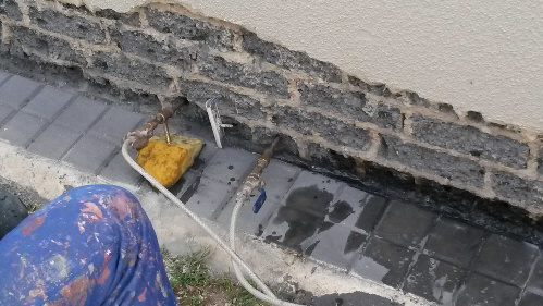Damp plaster in all affected areas would be removed to height damp has risen. By Drilling 3 holes per brick-10mm dia – 90mm depth an injecting a silicone resin, which cures in contact with water, into the brickwork immediately above floor level, the path of moisture migration will be dissected by an impermeable layer resisting any further capillary action.